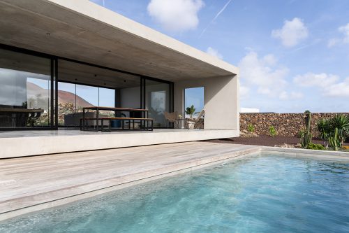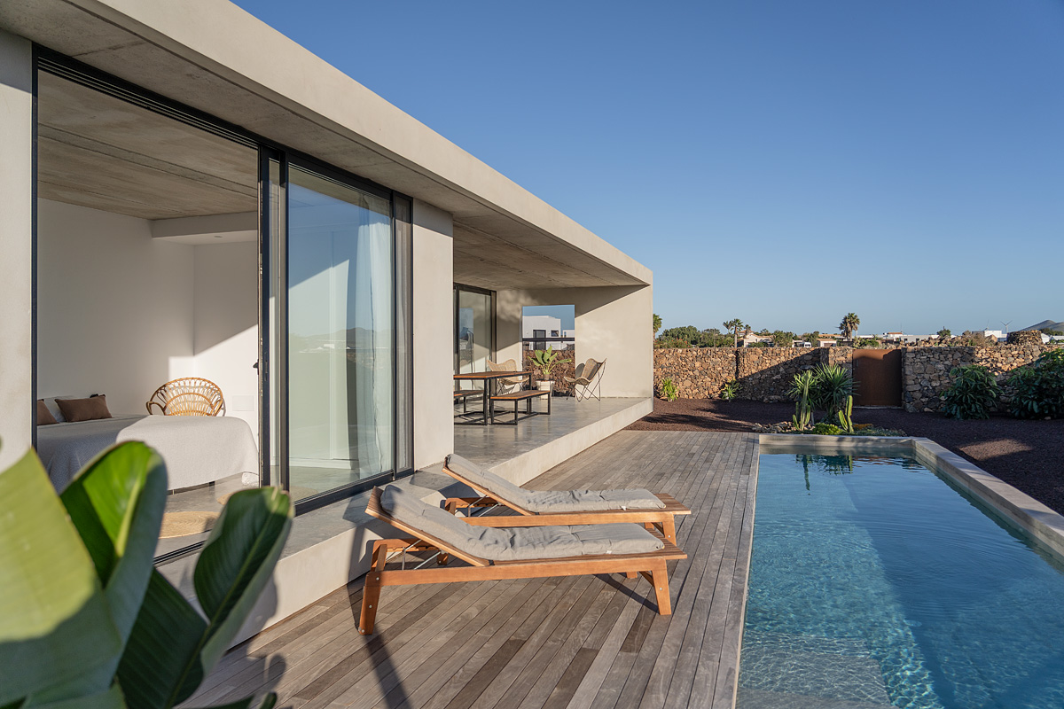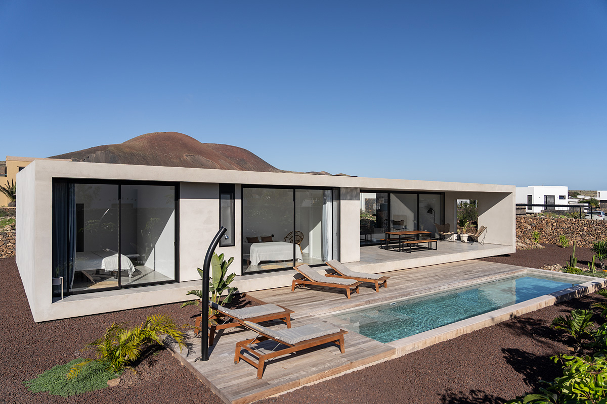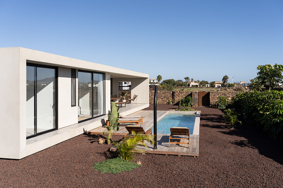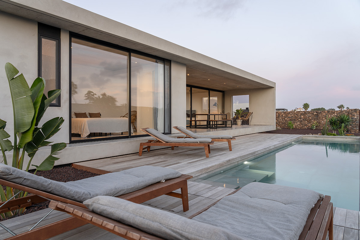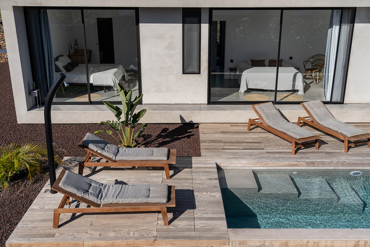 New build holiday house in Lajares (2025). Located in an exclusive zone of Lajares right under the volcano ‘Calderón Hondo’. The house consists of three bedrooms, each one with an en suite bathroom, storage room, kitchen, living room. Wooden deck with outdoor shower and heated pool (27 ºC • 11 x 2,5 m). Minimalist design with extensive glazing providing great views to one of the most beautiful landscapes of the north of Fuerteventura.