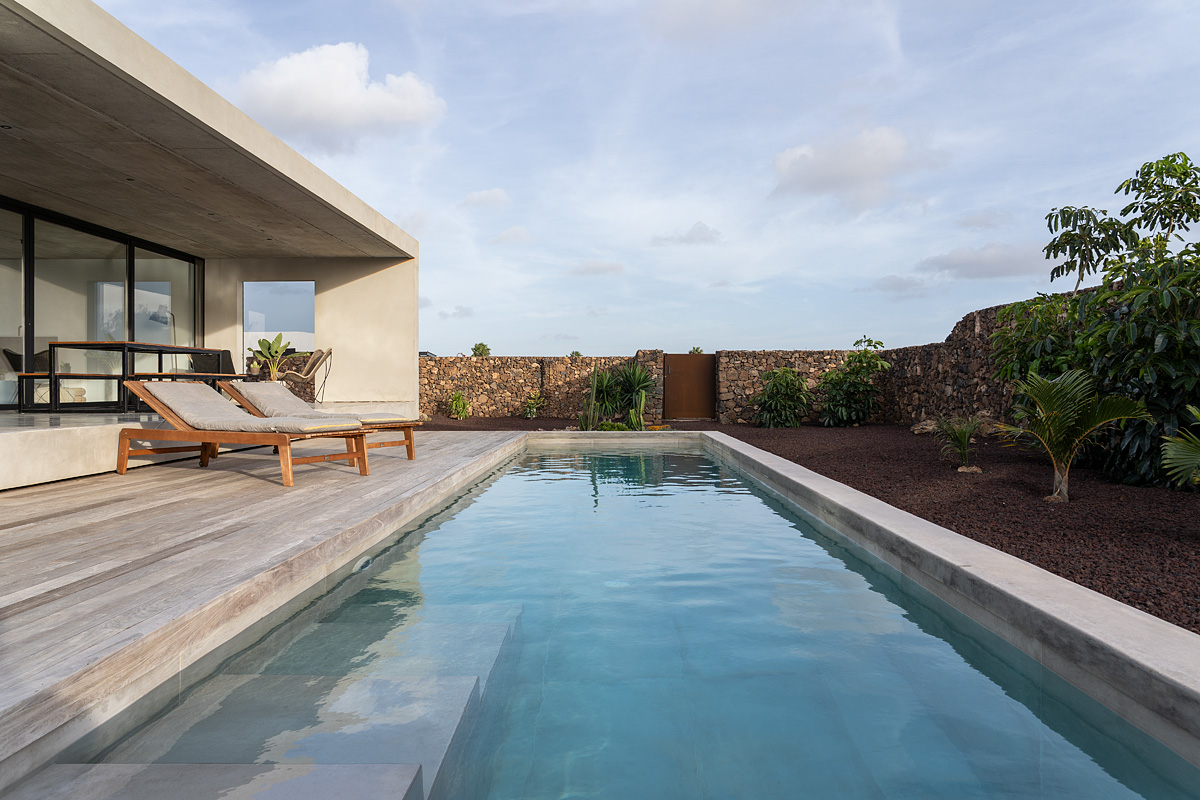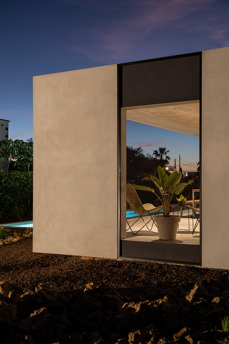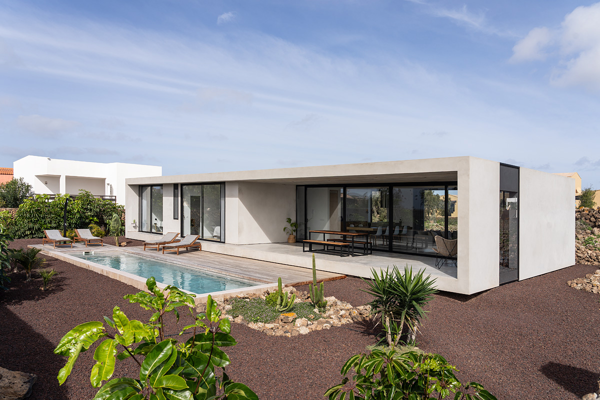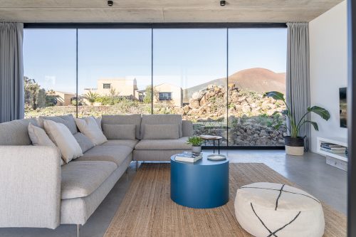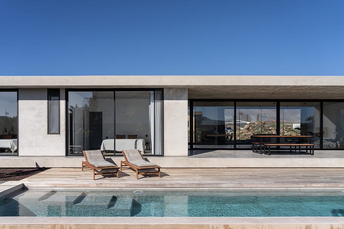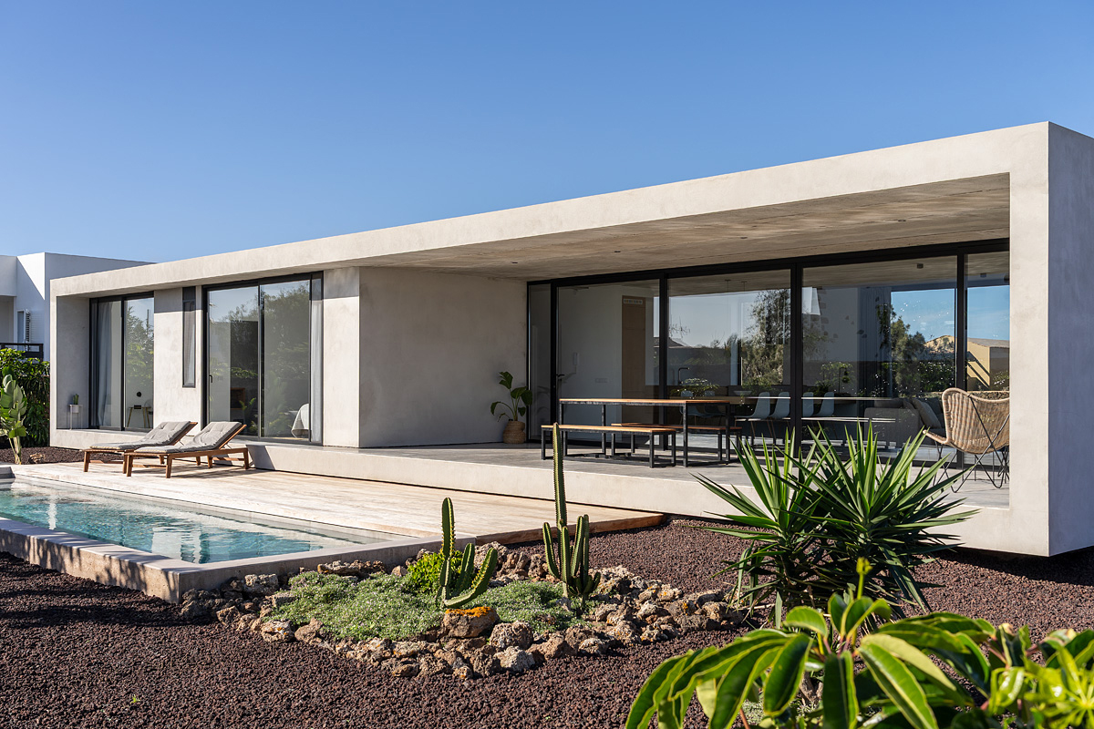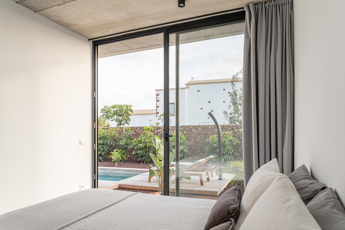 New build holiday house in Lajares (2025). Located in an exclusive zone of Lajares right under the volcano ‘Calderón Hondo’. The house consists of three bedrooms, each one with an en suite bathroom, storage room, kitchen, living room. Wooden deck with outdoor shower and heated pool (27 ºC • 11 x 2,5 m). Minimalist design with extensive glazing providing great views to one of the most beautiful landscapes of the north of Fuerteventura.