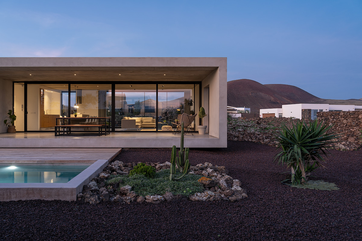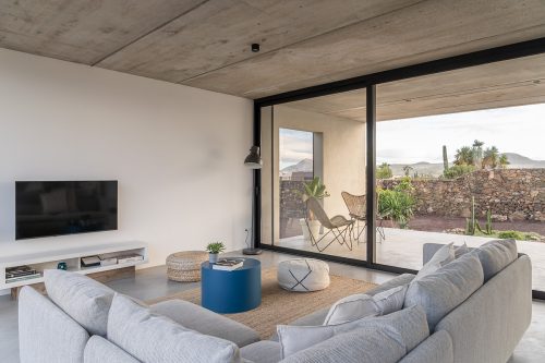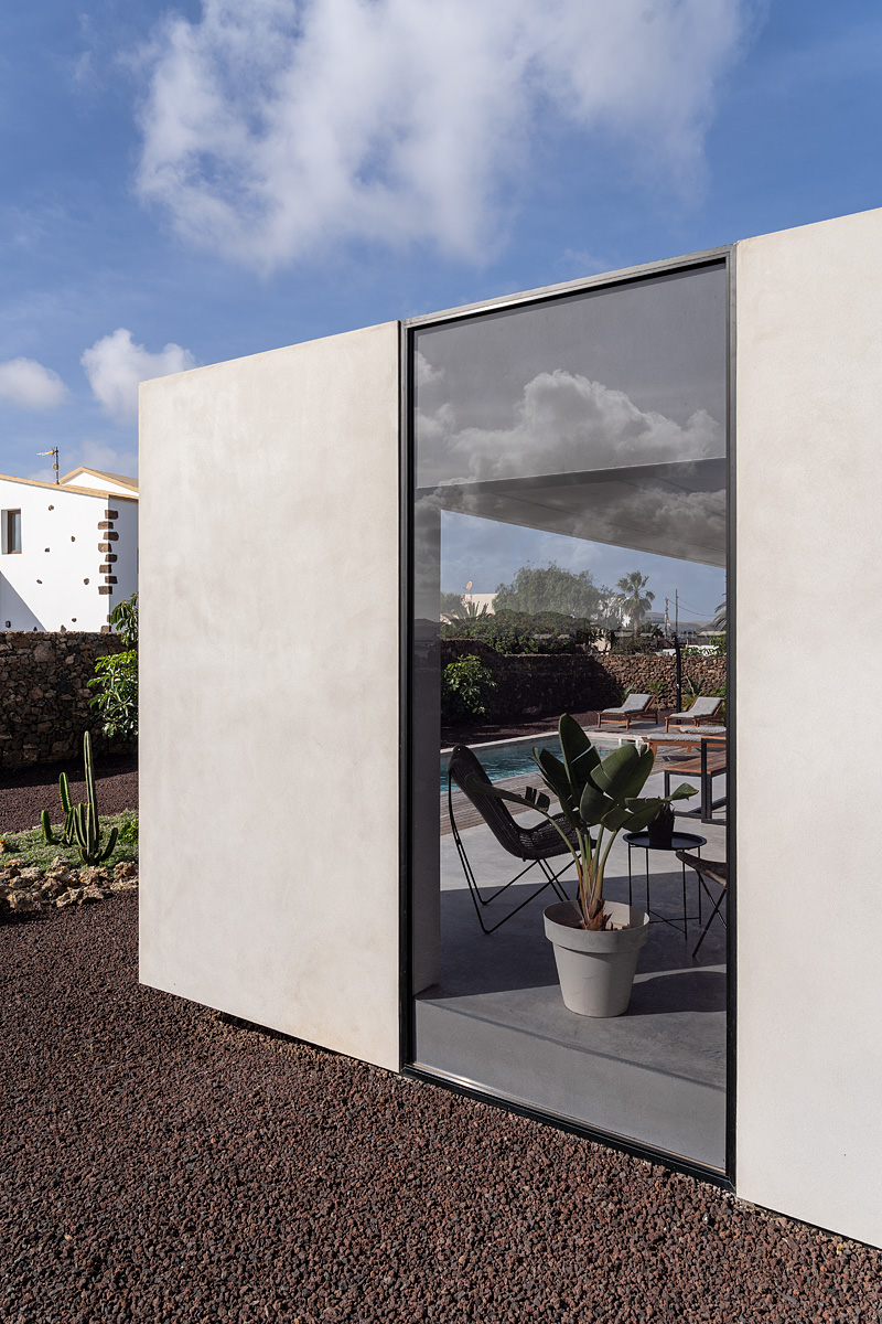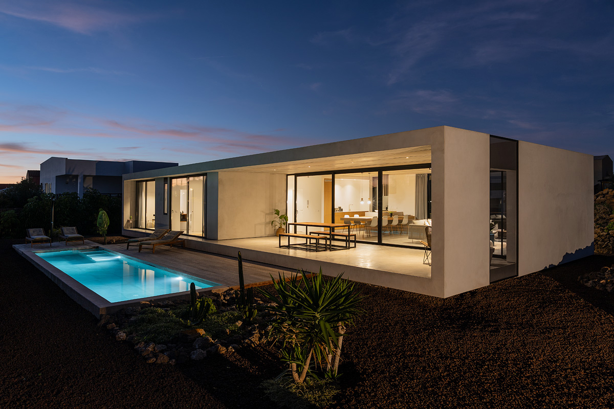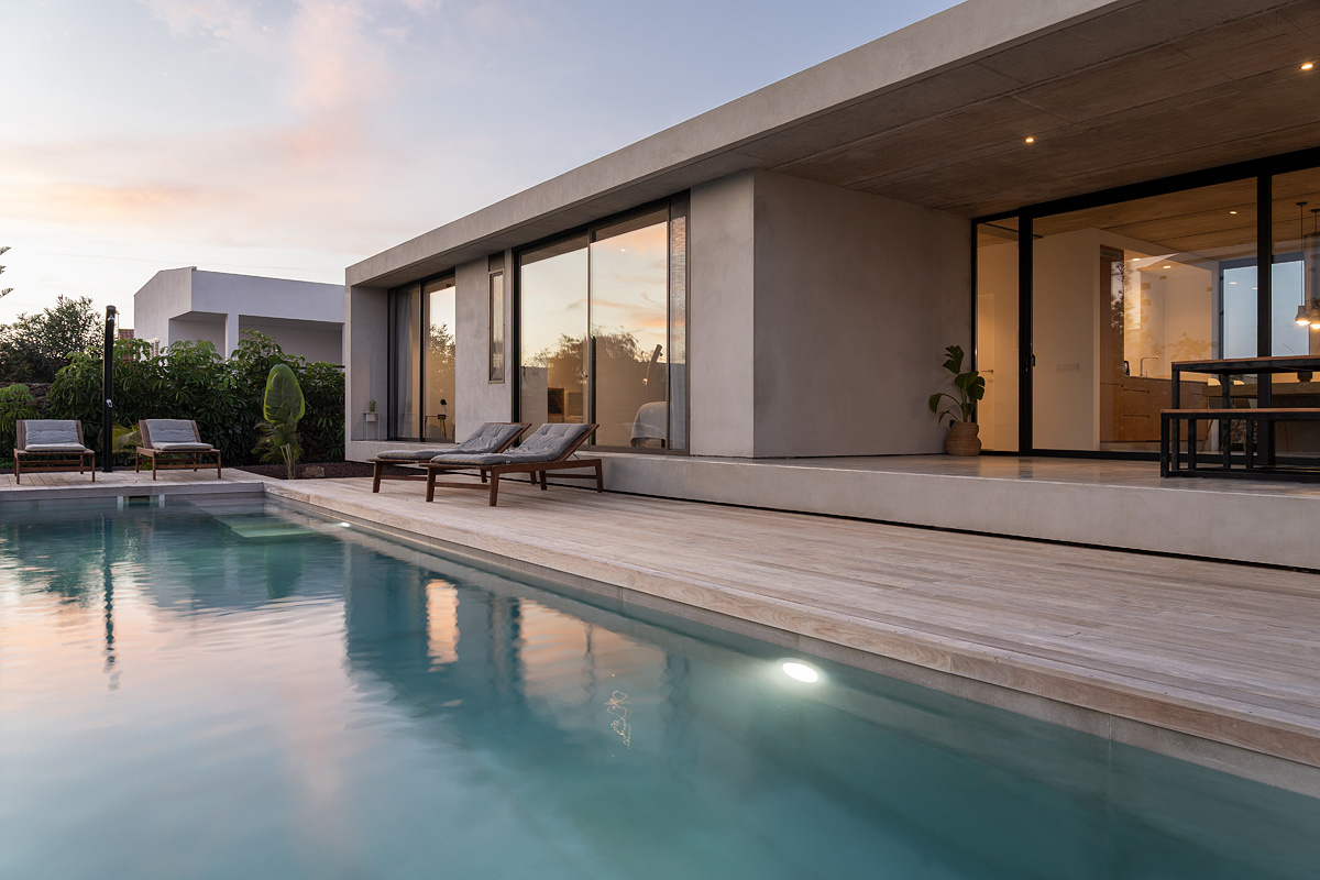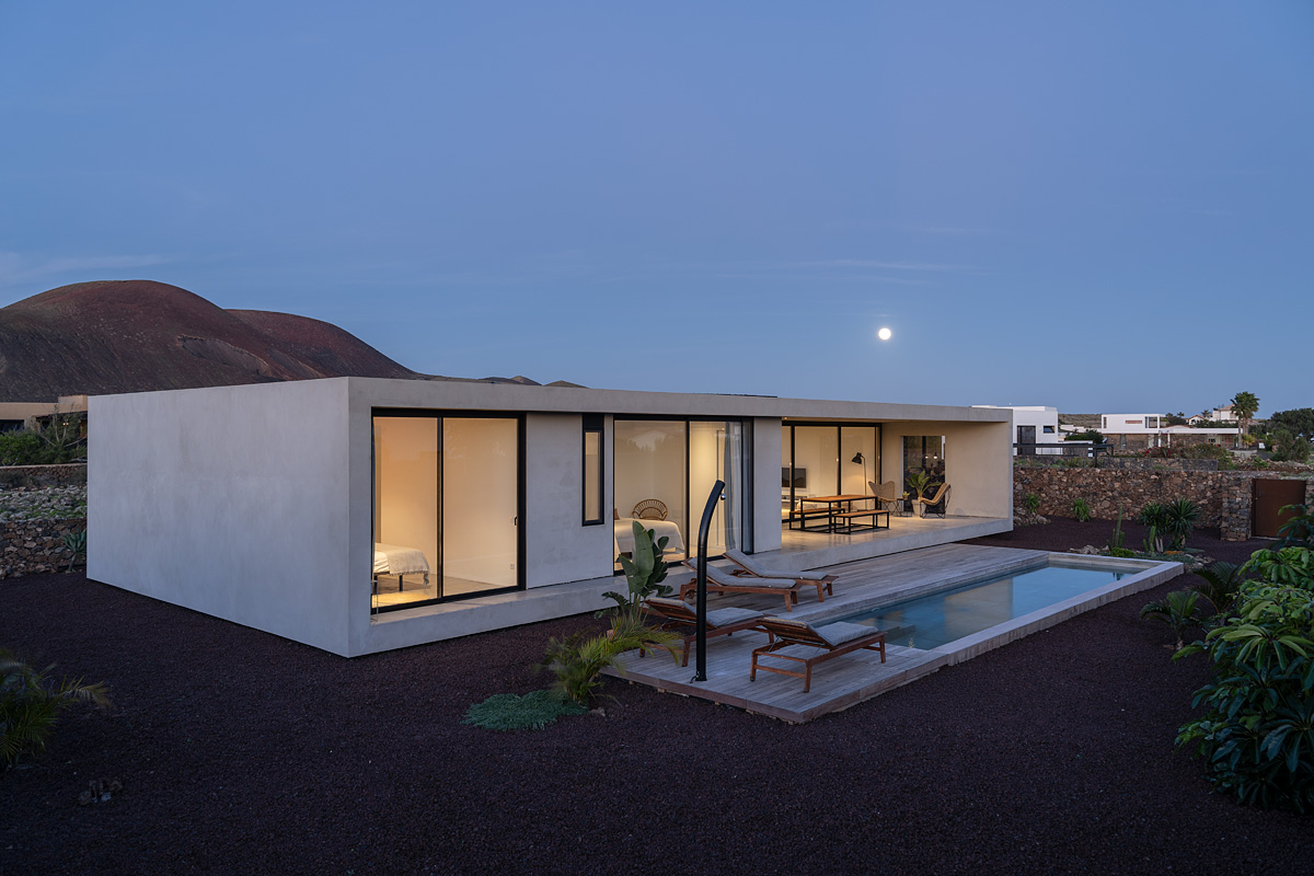 New build holiday house in Lajares (2025). Located in an exclusive zone of Lajares right under the volcano ‘Calderón Hondo’. The house consists of three bedrooms, each one with an en suite bathroom, storage room, kitchen, living room. Wooden deck with outdoor shower and heated pool (27 ºC • 11 x 2,5 m). Minimalist design with extensive glazing providing great views to one of the most beautiful landscapes of the north of Fuerteventura.